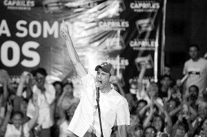 委内瑞拉大选临近 3月21日,委内瑞拉反对党联盟候选人卡普里莱斯在纳瓜纳瓜举行的竞选集会上讲话。随着委内瑞拉总统选举日期临近,代总统马杜罗和反对党联盟候选人卡普里莱斯的竞选活动也进入白热化。委内瑞拉总统查韦斯本月5日因病去世后,委国家选举委员会宣布于4月14日重新举行总统选举。新华社发