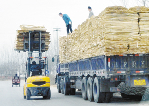 3月23日,记者看到淮阳县境内许多工人正把杨木单板打包外运。我市地处平原,杨树等木材资源十分丰富。淮阳县部分乡镇群众利用本地资源长期加工生产杨木单板销往外地,经济效益可观。