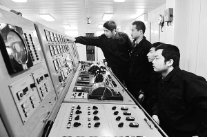 3月25日,中国渔政206船轮机部的船员在主机集控室。当日,正在钓鱼岛海域执行常态化护渔巡航任务的中国渔政206船遭遇九级大风。轮机人员精心看护渔政船关键部位,确保船舶航行安全。