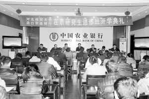 为加快人才强行进程,为青年员工铺就成长道路,提升全行企业文化建设内涵,近期,周口农行与河北经贸大学联合开办在职研究生进修班,鼓励青年员工加强学习,全面提升综合素质。图为该行在职研究生进修班开学典礼。