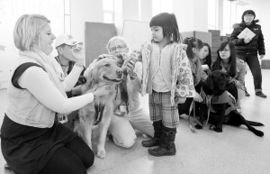 工作犬进校园 3月28日,乐成学校的小朋友在与医疗辅助犬西米亲密接触。 当日,“我们今天开始交朋友——工作犬走进校园”公益活动在北京举行。 新华社发