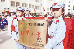 两名红军小学学生在活动现场手持延安杨家岭红军小学校牌。4月2日,全国红军小学建设工程理事会为延安杨家岭红军小学和延安马文瑞红军小学举行授旗授牌仪式。仪式上,老革命家亲属和爱心企业、爱心人士共捐赠30万元以及数字化电影放映设备、60部影片、电教设备、图书4000册等。(新华社发)