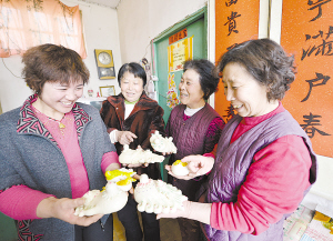 4月3日,山东省即墨市移风店镇太祉庄农民在相互观赏制作的“面燕”。清明节正是燕子回迁的时节,我国山东等地区有清明捏“面燕”的习俗。“面燕”是用小麦面粉配上食用染料,经手工揉制、塑形、剪嘴、压翅等工序,最后上锅蒸制而成,表达人们对春天来临的喜悦之情,期盼新的一年农业生产风调雨顺。(新华社发)