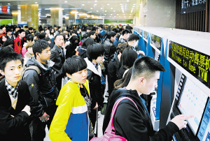 4月3日,在天津火车站,旅客在自动售票机前排队买票、取票。清明小长假临近,由于旅游、探亲访友、扫墓祭祖等客流有所增加,天津站逐渐迎来客流出行高峰。 (新华社发)