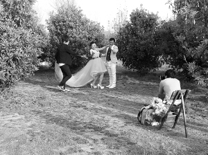 百花盛开,姹紫嫣红。眼下正是初春,周口公园吸引了不少新人拍摄婚纱照。这些新人和婚纱影楼摄影师正是看中了公园秀美的绿色和清新的环境,才选择这里作为外景拍摄基地。图为一对新人正幸福地摆poss。(记者 刘彦章 摄)
