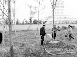 周口公园目前正在栽植从外地引进的名木,图为施工人员进行栽后浇水。市民希望这些珍贵的树木能够保证质量,做好维护,栽种好,成长好。本报记者 摄