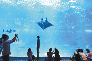 4月9日,人们在新加坡圣淘沙名胜世界海洋生物园内的水族馆参观。4月8日,新加坡圣淘沙“名胜世界”发布消息说,它旗下的核心景点之一S.E.A.海洋馆被吉尼斯世界纪录确认为世界最大的海洋馆。同时,海洋馆内重达25万多公斤、宽36米、高8.3米的单体亚克力面板则被确认为世界最大的水族观景窗。 新华社发