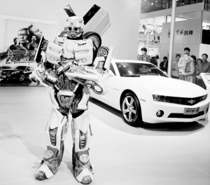 4月11日,雪佛兰展台请来变形金刚“大黄蜂”助阵。当日,2013大河春季车展在郑州市会展中心开幕。本次车展汇集了70余个国内外汽车品牌、百余台各式新车,车展现场还推出形式多样的购车优惠活动,吸引众多市民前来参观、选购。新华社记者 李博 摄