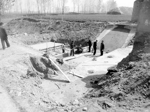 在赵德营镇麦田间工人们正在维修一个提灌闸。