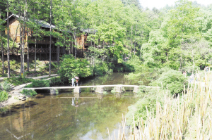 4月14日,游客在贵阳小车河湿地公园的石桥上漫步。近年来,贵阳市在中心城区挤出土地建成3个湿地公园,总占地面积16平方公里,不仅成为市民休闲观景的胜地,也使这座高原城市形成“显山、露水、见林、透气”的独特风格。(新华社发)