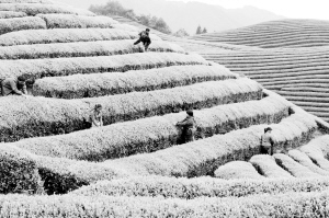 4月14日,采茶工在浙江省武义县一茶园采摘茶叶。清明过后,浙江武义高山茶进入采摘高峰期。该县种植的茶叶清明后谷雨前为最佳采摘期,一般只摘一芽一叶或一芽两叶。雨前茶叶肥汁满,汤浓味厚,与明前茶同为一年之中的佳品。 (新华社发)