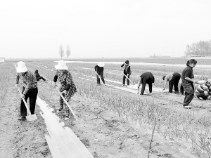 昨日,商水县舒庄乡的农民钟点工在百亩瓜果园里种植西瓜。目前正是春耕大忙季节,在田野里到处都可以看到农民钟点工的身影。