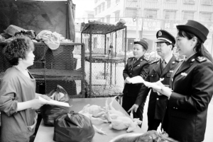 近日,扶沟县工商局执法人员对辖区内各个超市、集贸市场等禽肉专柜、摊位进行检查,严查禽类销售主体资质、禽类动物检疫证明,严厉打击加工、经销来源不明、无检疫证明和死因不明畜禽类产品行为。图为该局执法人员正在一摊点责令其立即暂停营业。(卢付昌 摄)