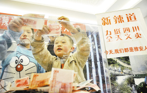 4月21日晚,两位儿童将在一家饭店消费的款项直接投入捐款箱。当日,邯郸市的一家饭店举行全天义卖活动,将当天营业款全部捐给地震灾区。(新华社发)