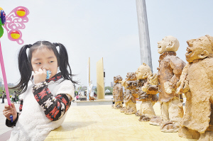4月21日,在太康县人民广场上展出的祝敬之泥雕作品吸引了一位小女孩观看。当天,太康县首届“万城杯”民间文化艺术精品展演在太康县人民广场集中展出,经过太康县文化艺术联合会深入挖掘的布袋偶、夯歌、剪纸、纸扎等多种民间文化艺术项目吸引了众多群众前来观看。(记者 刘俊涛 摄)