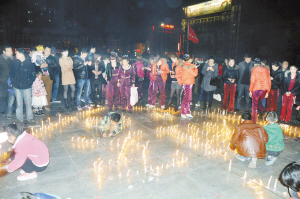 23日晚上,市民们来到五一广场,点燃了带有心形“雅安”等字样的500余根蜡烛,用周口人最朴素的方式,为灾区人民点蜡祈福。 (记者 王亚辉 摄)