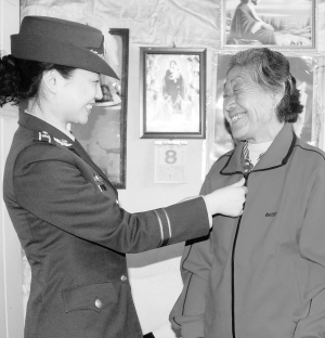 ① 5月9日,辽宁边防总队葫芦岛边检站的王杨(左一)为驻地双龙街道的失独妈妈樊素艳穿上送来的新衣服。