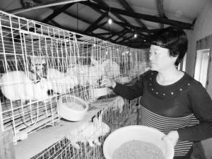 商水县舒庄乡农村妇女訾春玲在为兔加料。去年以来,訾春玲靠养獭兔纯收入5万多元。目前,全乡1200多名农村妇女靠养兔走上了致富路。(乔连军 摄)