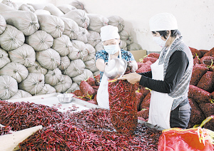 项城市汇远辣椒种植专业合作社的工人正在包装三樱椒。该合作社采用“公司+基地+农户”的模式,种植三樱椒2500多亩,辐射带动周边农户种植5000多亩,拥有社员296户,每年生产鲜辣椒9200多吨,加工干辣椒2300多吨,产品出口美国、英国等多个国家,年出口创汇2000多万美元,社员年收入12000多元,提升了当地农民收入,为农村经济注入了活力。(朱亚洲 摄)