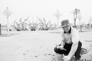项城市驸马沟整治项目一期工程投资4500万元,两侧是50~70米的风景绿化带,并进行水系改造、清淤净底、绿化景观建设,建成后将成为市民观光休闲娱乐场所。图为一名工人正在驸马沟广场整修路面。(赵献伟 摄)