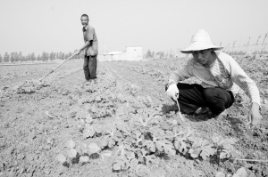 商水县袁老乡二府村村民在西瓜地里除草。该县积极引导群众改变单一种植模式,大力发展棉瓜间作套种,亩可增收2500元。(刘飞 魏红 摄 )