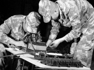 西华县人武部以实战为背景,针对未来战时任务需要,积极组织民兵开展夜训,锤炼民兵队伍在复杂条件下遂行多样化军事任务能力。图为该县民兵通信分队正在开展夜间线路中断后的架通与维护保障训练。(李自强 摄)