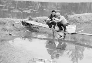 南京市水产科学研究所的水产高级工程师茆健强,自年初以来参加市总工会组织的建设“美丽乡村”职工科技服务活动,与市郊农村30个水产养殖户结对,开展科技帮扶。据悉,南京市共有1000多名农技专家参与建设“美丽乡村”科技服务行动,他们进村庄、下田头、到农户,以各自的技术专长为“美丽乡村”出谋划策。图为茆健强(右)对青虾养殖户武温兴进行青虾种苗繁育技术指导。新华社记者 孙参 摄