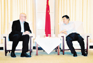 图为市委书记徐光与美国客商艾柏强亲切交谈。(记者 沈湛 摄)