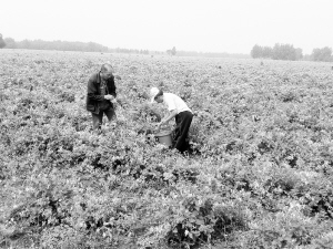 项城市花园办事处大学生村干部付春生发起成立项城市绿原种植专业合作社,带动40多户当地群众发展金银花种植。目前,该合作社已种植金银花2000余亩,年产值达1600万元。图为当地群众利用农闲时间到该合作社的种植基地采摘金银花,每天收入可达100多元。(记者 李寒 摄)