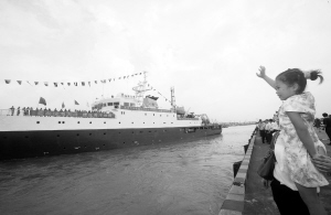 “海洋六号”奔赴太平洋 开展新一轮科学考察 5月28日,“海洋六号”起航后,一名科考队员的女儿在码头向科考船挥手告别。当日,96位科学考察队员搭乘“海洋六号”综合调查船驶离位于广州的海洋地质专用码头,开赴太平洋开展为期5个月的国际海底矿产战略勘查。