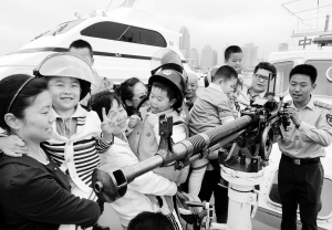 小小船员登船艇 颗颗童心爱海疆 5月28日,小朋友们在边防巡逻艇上参观。“六一”前夕,青岛公安边防船艇大队举行船艇开放日活动,邀请部分幼儿园、小学的小朋友们登上船艇参观,跟着边防叔叔模拟值守巡逻岗位,体验一次边防生活。