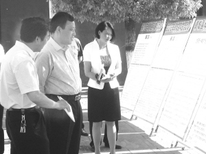 5月14日,郸城县科技活动周全面展开。活动期间,共发放资料1.5万套,展出图片100余幅,咨询群众达8000余人次,生动活泼地展示了科技对经济发展和民生改善所起到的巨大作用,进一步提高了社会各界的科技意识和创新精神。图为县委书记刘广明、副县长刘淑杰在观看展板。(记者 卢好亮 通讯员 马剑虹 摄)