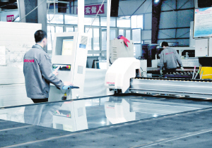 图为在市开发区高科技工业园内,福源玻璃有限公司生产车间一角。近年来,福源玻璃有限公司经过滚动式发展,已成为具有较大规模、专业从事汽车安全玻璃和民用建筑安全玻璃生产的股份制企业。