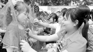 左中图:5月28日,商水县舒庄乡的“爱心妈妈”为乡中心幼儿园准备表演节目的留守儿童化妆。当天,6名“爱心妈妈”还给幼儿园赠送了16套演出服装,并观看了孩子们的精彩表演。(乔连军 摄)