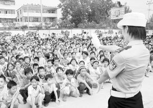 左下图:商水县交警大队在学校为学生举办交通安全知识讲座。这是商水交警为把“大排查,大教育,大整治”推向深入的一个特色宣传方式,从“教育一个孩子”做起,从而“影响一个家庭,带动整个社会”。 (党敏 摄)