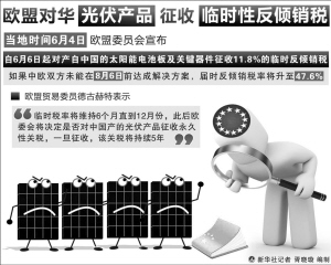 6月4日,欧盟委员会不顾中国反复交涉和多数成员国反对,宣布从6日起对中国的光伏产品征收临时反倾销税。欧盟委员会这一明显带有贸易保护主义色彩的举措令中方不满,中方表示坚决反对,商务部已启动对欧盟葡萄酒“双反”调查程序。
