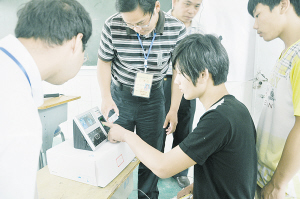 下图:考生进入考场坐在身份验证终端设备前进行演练。