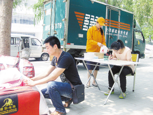 昨日,邮政工作人员在为一名即将毕业离校的大学生办理包裹邮寄。为方便高校毕业生,市邮政局工作人员于近日主动进校园为毕业生办理邮寄业务。(记者 沈湛 摄)