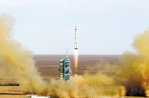 17时38分,随着一声“点火”口令,承载着神舟十号载人飞船的火箭,在巨大的轰鸣声中冲天而起,飞向茫茫太空。