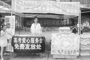 不少商家为高考考生提供免费热情服务。高考期间,沈丘九牧洁具、皇朝家私等商家组织20余名人员,出资两千余元,在沈丘六个考点设立高考爱心服务台,在炎炎夏日免费为考生及家长提供瓶装矿泉水等防暑物质,同时出动六辆车,免费接送考生参加考试。(记者 韦伟 摄)