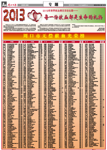 今天是世界献血者日十周年纪念日,借此机会向多年来关心支持我市无偿献血工作的各级党委、政府领导,社会各界及全市人民表示衷心的感谢!向广大无偿献血者致以节日的问候!向获得全国无偿献血金、银、铜奖的无偿献血者表示热烈的祝贺!