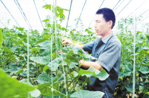 昨日,太康县白云蔬菜合作社菜农在管理大棚黄瓜。该蔬菜种植合作社经过几年发展,已经培养专业技术人员100多名。(记者 沈湛 摄)