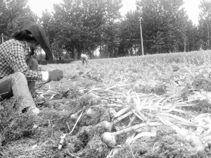 为有效地利用有限的土地资源,太康县积极探索间作套种新模式。图为高朗乡农民正在收获西瓜套种的大蒜。(记者 刘俊涛 摄)