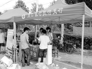 6月7日,周口银行扶沟支行开展“送爱心、送优惠”活动,在各考点门口,为考生提供纯净水、凉扇、帐篷等爱心物品,针对考生升学后在异地上学的具体情况,宣传周口银行的18项优惠项目,让更多的考生得到实惠。(记者 王泉林 通讯员 张欣 摄)