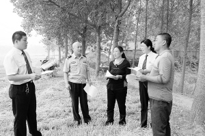 为切实减轻农民诉累,方便农民诉讼,扶沟县人民法院成立“三夏”涉农巡回法庭,对“三夏”涉农案件就地立案、审理、执行,并讲解安全生产知识、发放宣传资料,全力护航“三夏”生产,切实维护广大农民的合法权益。图为6月5日该院干警在麦收地头执行一起土地承包纠纷案。(记者 王泉林 通讯员 邹鹏举 摄)
