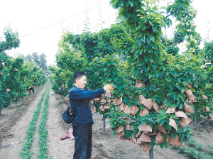 近年来,扶沟县韭园镇大力发展精品林业,取得了显著成效。目前,全镇已发展晚秋黄梨1300亩,总产量5800多吨,经济效益2344万元。图为该镇曹庄村村民谢丰收正在为晚秋黄梨套袋。(马海燕 摄)