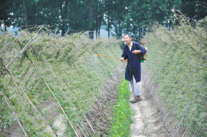 昨日,沈丘县北城办事处农民申天然在山药地喷洒农药。近几年,该县山药种植发展迅速,县城周边不少土地也被种植户租赁承包进行山药种植,山药种植已经成为沈丘县农民的主要种植产业之一。