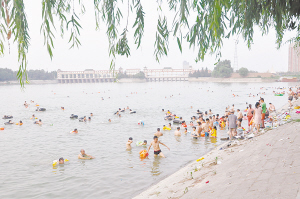 37.9℃!昨日我市气温再次“蹦高”,且刷新了今年入夏以来的最高记录。市气象台因此发布高温橙色预警信号。面对高温,众多市民选择到周口大闸上游游泳降温(右图)。(记者 王映 摄)