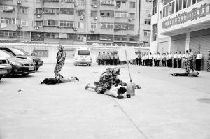 近日,周口市保安服务公司与中国银行联合进行了运钞车防抢劫演练和消防安全演练,以确保押运标的物的安全。图为演练现场。