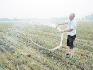 日前,由于降水稀少加上高温天气,一些秋苗开始出现不同程度的旱情。连日来,我市各级党委、政府积极组织群众迅速掀起抗旱保苗高潮,确保秋苗苗齐苗壮。图为农户正在给玉米苗浇水。